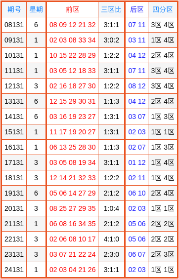 二区分析【13-24】:在积年大乐透第131期同时奖号中,该区开出率为28.24%,施展尽头冷淡。本期瞻望该区出号2枚,保举出号照拂:15、20。