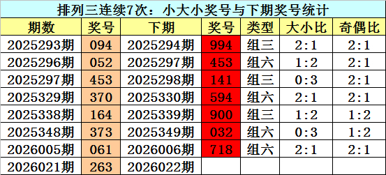 大小判断:上期成列三奖号为263,大小为:小大小,近7次大小为小大小的奖号为:094-052-453-370-164-373-061。