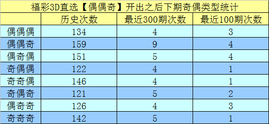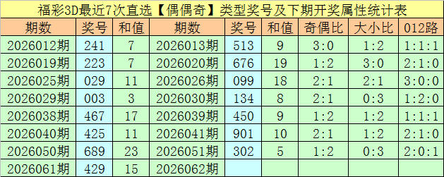 前7次出现偶偶奇类型奖号辩认为:241、223、029、003、467、425、689,其下期辩认开出奖号:513、676、099、134、450、901、302。